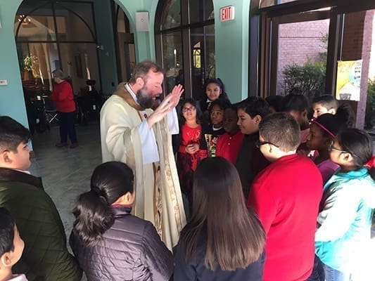 Father Kevin Hargaden, pastor of St. Matthew Church, Tyrone, blessed the clothing while surrounded by the students. The parish will deliver the socks and other items. He also talked to the students about Sts. Cyril and Methodist, whose feast day is Feb. 14.