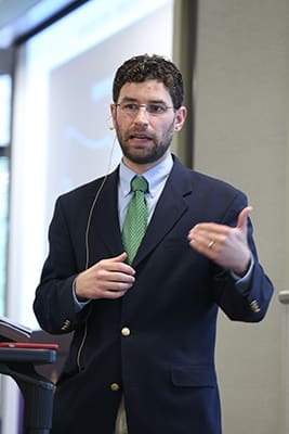 Brett Robinson, Ph.D., from the McGrath Institute for Church Life at the University of Notre Dame, was one of three presenters during the session for parish leaders. Here he conducts a presentation on “Markers of a Digital Culture.” Photo By Michael Alexander