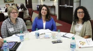 (L-r) Martha Robert, director of religious education at St. Jude the Apostle Church, Sandy Springs, Rosana Szvarca of the St. Jude the Apostle Church Brazilian community and Kathy Guerrero, the youth minister at Immaculate Heart of Mary Church, Atlanta, participate in a table discussion on reaching out to young adults in the digital age. Photo By Michael Alexander