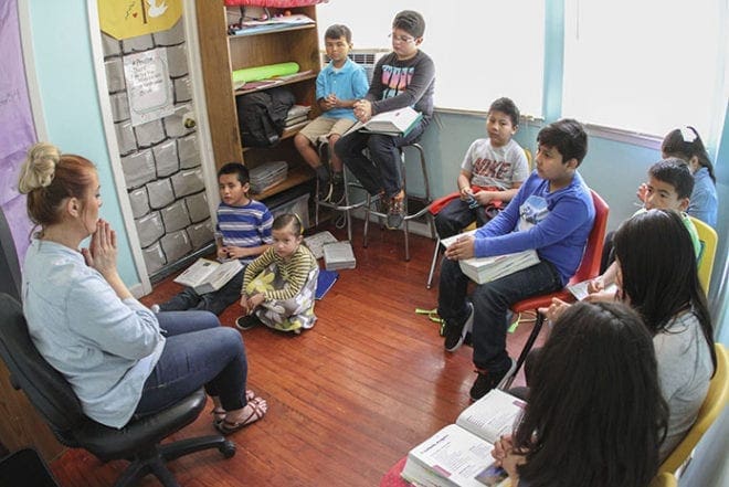 In cramped quarters, religious education instructor Bethany Nevarez, sitting left, prays with her first-year, first Holy Communion class in one of three small rooms upstairs over the main church. Photo By Michael Alexander