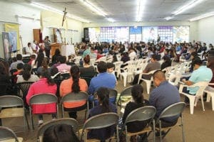 The parish, which already owned land for a future building, has been renting storefront space but still could not accommodate growth. Between 400 and 500 people squeeze into the rented space, which is in need of repairs, to attend Mass. They are not deterred.