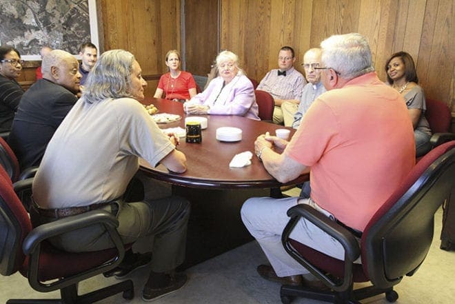 (Clockwise, from near end of the table) Deacon Richard Tolcher speaks during an informal gathering in the Arrendale State Prison conference room as Warden Kathleen Kennedy, Archbishop Wilton D. Gregory, prison ministry volunteers Dolly Fairclough of St. Thomas Aquinas Church, Alpharetta, transitional deacon Brian McNavish, Lisa Corcoran, chaplain Susan Bishop and Deacon Bernard Casey of St. Thomas Aquinas Church sit around the table. Seated in the background against the wall are the chaplain’s secretary Randall Frye, left, and deputy warden of care and treatment, Myra Orsborn. Anthony Dewberry, deputy warden of security, and St. Thomas Aquinas’ Paul Caruso, not pictured, were also present. Photo By Michael Alexander
