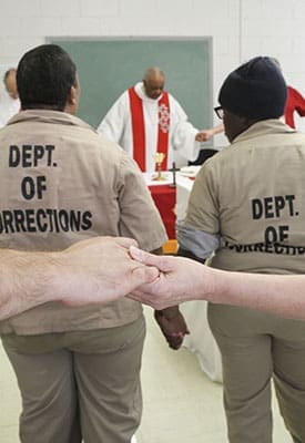 Transitional deacon Brian McNavish joins hands with an inmate during the praying of the Our Father. Photo By Michael Alexander