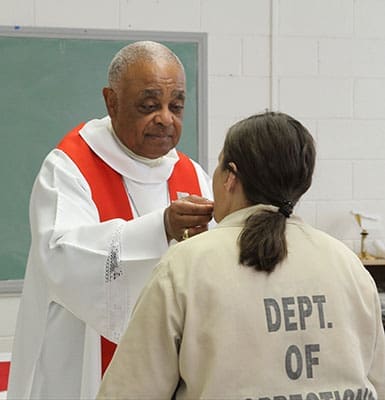 Following Mass, Archbishop Gregory and Deacon Tolcher met with an inmate unable to attend liturgies because she is segregated from the general prison population. She received the Eucharist for the first time in many years.