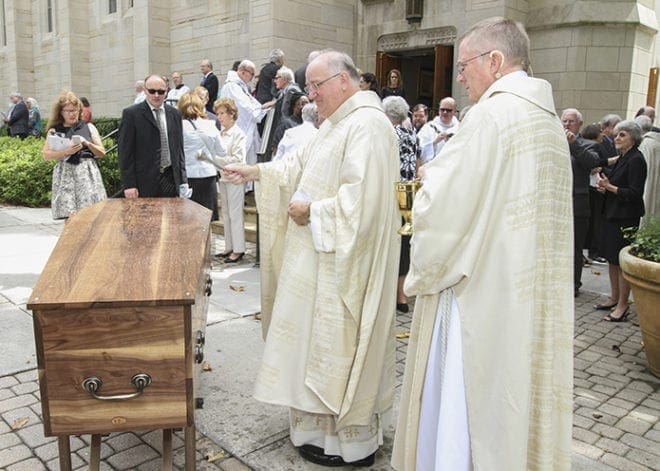 Father Paul Flood, pastor of St. Benedict Church, Johns Creek, sprinkles holy water over the casket of Father Terence A. Kane. Father Kane was the pastor during his second assignment as parochial vicar at St. Catherine of Siena Church, Kennesaw, and Msgr. Herbert was the pastor during his first assignment at Corpus Christi Church, Stone Mountain. Photo By Michael Alexander