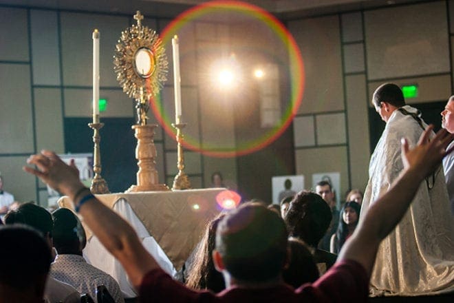 The young adult track at the Eucharistic Congress included a period of adoration of the Blessed Sacrament as the track came to a close on Friday, June 16. Photo by Thomas Spink