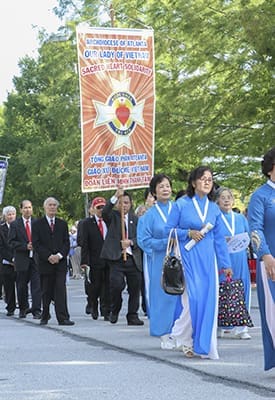 Women and men from the Vietnamese community participating in the morning procession provide one piece of the colorful tapestry that makes up the cultural diversity in the Archdiocese of Atlanta. Photo By Michael Alexander