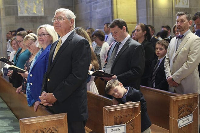 (Front pew, r-l) Joseph and Peggy Kuhr, the parents of Father Bryan Kuhr, are on hand, along with other relatives like (second pew, r-l) their grandson Aidan Druppel and his father, Jason, to witness the priestly ordination of their son. Photo By Michael Alexander