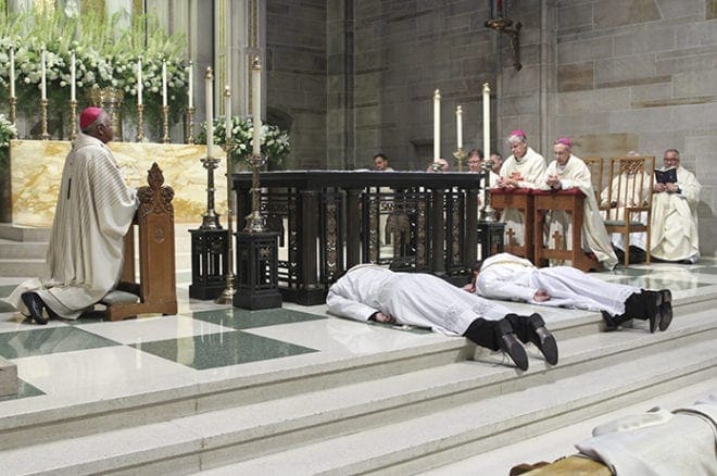 Ordination candidates to the priesthood, Rev. Mr. Bradley Starr, left, and Rev. Mr. Bryan Kuhr prostrate themselves before the altar at the Cathedral of Christ the King, Atlanta, during the invitation to prayer. Photo By Michael Alexander