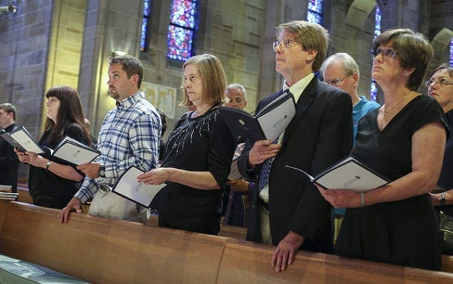 Bishop-designate Bernard E. “Ned” Shlesinger III’s relatives (front pew, l-r), including his sister Kathleen O’Hern and her son Steve from Bear Lake, Minn., and from Mount Vernon, Va., his sister Anne, his brother Jim and his wife Jodi, join a host of other relatives and friends for the July 18 vespers service at the Cathedral of Christ the King, Atlanta. Photo By Michael Alexander