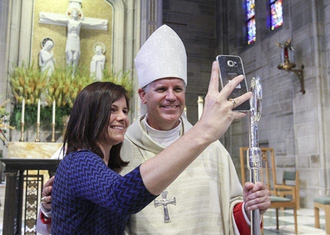 After the episcopal ordination and meeting with clergy on the Cathedral of Christ the King plaza, Bishop Bernard E. “Ned” Shlesinger III returned to the cathedral’s interior to take photos with family and friends. Here his niece, Kristina O’Hern of Minnesota, takes a selfie with her uncle, the Archdiocese of Atlanta’s newest bishop. Photo By Michael Alexander