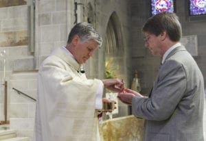 As family members fall in line for holy Communion, Bishop Bernard E. “Ned” Shlesinger III, left, distributes the Body of Christ to his brother, Jim, of Mount Vernon, Va. Photo By Michael Alexander