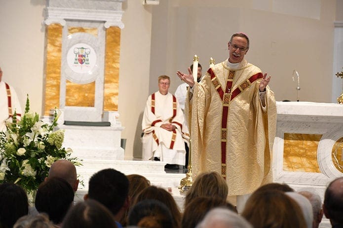 When he delivered the homily, Bishop Zarama stepped down from the sanctuary and stood in the main aisle of the new cathedral, which was dedicated July 26.