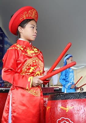 The bilingual Mass included traditional Vietnamese drummers, scores of members of the Vietnamese Eucharistic Youth Movement in colored neckerchiefs, along with eight priests concelebrating with the archbishop. A choir of women and men dressed in red and white robes sang hymns in Vietnamese.