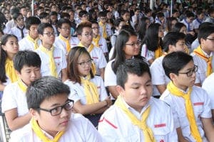 Over 1,000 members of the Eucharistic Youth Movement sit in the congregation under a large tent during the Aug. 27 Mass at the Holy Vietnamese Martyrs Church. Some 3,500 people were on hand for the liturgy, which was followed by a groundbreaking for the parish’s new church. Photo By Michael Alexander