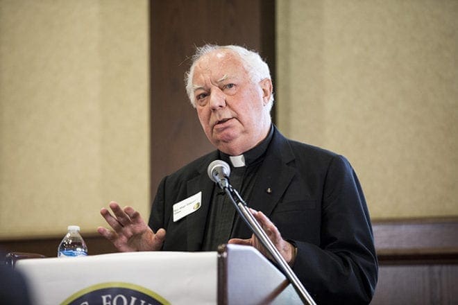 Msgr. Edward Dillon, pastor of Holy Spirit Church, Atlanta, and one of the founders of the Catholic Foundation of North Georgia, reminisces about the foundation’s inception at the Deo Gratias luncheon Aug. 26. Photo By Allison Shirreffs