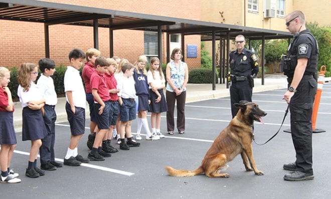Brookhaven Police Department K-9 handler Officer David Fikes, right, and his full-service police work dog, Dano, demonstrate a series of commands in front of Sgt. Jake Kissel and Kathryn Berg’s fifth-grade class at Our Lady of the Assumption School. Fikes and Dano, a Belgian Malinois, have been partnered together for nearly 3.5 years. Photo By Michael Alexander