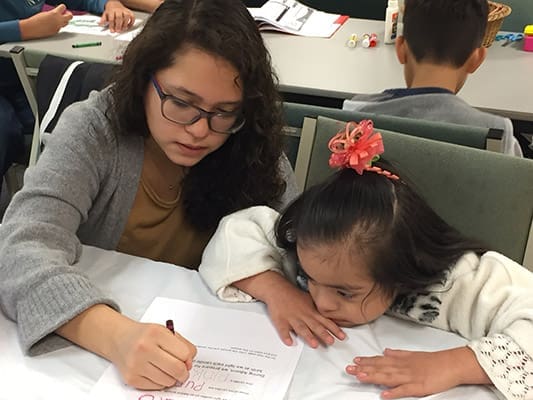 Metztli Munoz, left, is the teen volunteer paired with Alondra Martinez, at right for Guardian Angels at St. Francis of Assisi Church. Munoz is considering a career in special education because of her involvement in the faith formation ministry for children with disabilities.