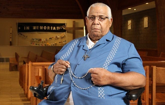 The 86-year-old widower is wearing a baseball cap with the word “FORGIVEN” written across the front. Around his neck are a small crucifix on a chain, a religious scapular and a Miraculous Medal, which was a gift from the late Archbishop Thomas C. Kelly of the Archdiocese of Louisville, Kentucky. Brito occupies a spot in the rear of the church, reserved for people with disabilities. His daughter gets him there early, so he has time to pray the rosary before Mass.