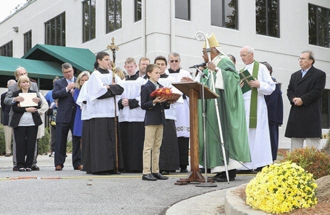 Eleven-year-old Joshua Snowberger holds a statue of Mary Our Queen in a basket, as Archbishop Wilton D. Gregory blesses it. The statue will be buried in the foundation of the new sanctuary. Photo By Michael Alexander