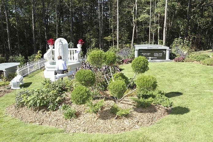 Honoring his wife, Schollian started a foundation to pay burial costs for families who cannot afford to put loved ones to rest. Some 50 grave sites in the 26-acre cemetery sit between white marble statues of Our Lady of Fatima and the Divine Mercy of Jesus. The foundation purchased this parcel of land, surrounded by white encore Azaleas and flowering rose of Sharon bushes.