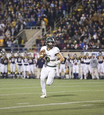 Blessed Trinity High School quarterback Jake Smith (#9) looks down field for an open receiver, but runs for a first down instead. Smith ran for 26 yards and completed 11 of his 12 passes for 111 yards. Blessed Trinity defeated Marist 16-7 to capture its first state football championship Dec. 15. Photo By Michael Alexander