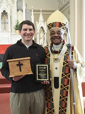 Marcus Walker, left, the 2018 recipient of the Msgr. Edward B. Branch Young Adult Award, poses for a photo with Archbishop Wilton D. Gregory. Walker is a member of Church of the Transfiguration, Marietta. Photo By Michael Alexander