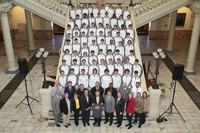 ATLANTA–Sixty-eight members of the Blessed Trinity High School state championship football team joined Ricky Turner, athletic director; Tim McFarlin, head football coach; Brian Marks, principal, and a host of other coaches and trainers during a Jan. 24 visit to the Georgia State Capitol.