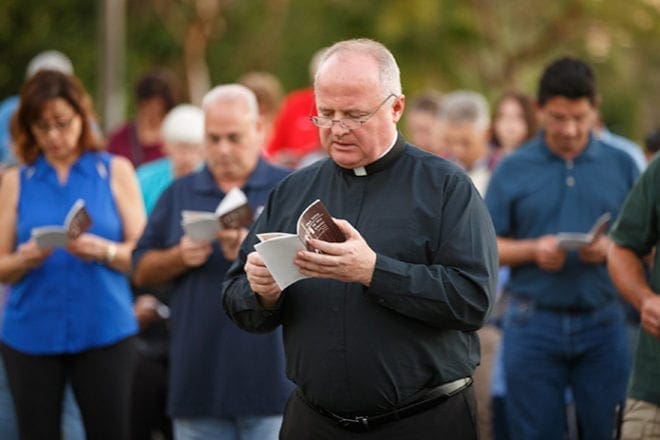 Father Ireneusz Ekiert, administrator of Mary Help of Christians Church in Parkland, Fla., leads parishioners during an outdoor Stations of the Cross service Feb. 16 dedicated to the victims and survivors of the deadly mass shooting at nearby Marjory Stoneman Douglas High School. At least 17 people were killed when 19-year-old former student Nikolas Cruz stormed the school with an AR-15 semi-automatic style weapon. At least one member of the parish was among those killed, according to the parish administrator. CNS photo/Tom Tracy