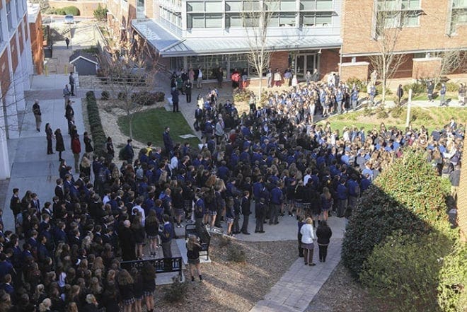 Some of the estimated two to three hundred students gather at Marist School’s Alumni Plaza, March 14, as part of the National School Walkout. For 17 minutes, students and faculty members participated in a silent protest against gun violence at schools across the country and to remember the 17 victims, shot and killed, at Stoneman Douglas High School in Parkland, Fla., one month earlier. Photo By Michael Alexander