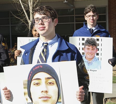 During the National School Walkout on March 14, (clockwise, from foreground center) senior Paul Plaia and juniors Danait Tesfai and Charlie Whitehead were three of the students at Marist School, Atlanta, who held posters displaying the 17 victims of the Stoneman Douglas High School shooting in Parkland, Fla., one month earlier. Plaia is holding 17-year-old Joaquin Oliver, while Whitehead holds 15-year-old Luke Hoyer. Photo By Michael Alexander