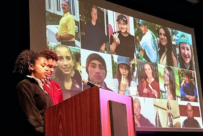 Seventeen larger-than-life photos of the victims killed in Florida were displayed in the darkened auditorium filled with students at Our Lady of Mercy High School.