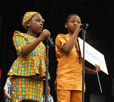 Students and their families, teachers, priests and special community guests attended a night of music and prayer. The school choir sang while students, dressed in their native country’s attire, gathered on the stage and thanked audience members in their native language. Student ambassadors lifted up prayers and Scripture readings, while St. John’s pastor, Father Michael Onyekuru, offered the Gospel.