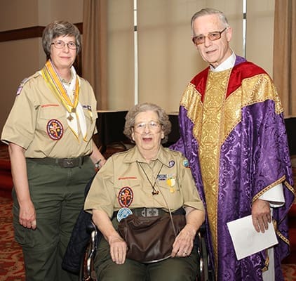 (L-r) Mary Daube of St. Marguerite D’Youville Church, Lawrenceville, and her mother Elvira McClain of St. Patrick Church, Norcross, join senior priest Father John Kieran for a photo. Daube and McClain have been involved in Scouting around the Atlanta Archdiocese for 25 and 45 years, respectively. Father Kieran was one of the founders of the archdiocesan Catholic Committee on Scouting 50 years ago. Photo By Michael Alexander