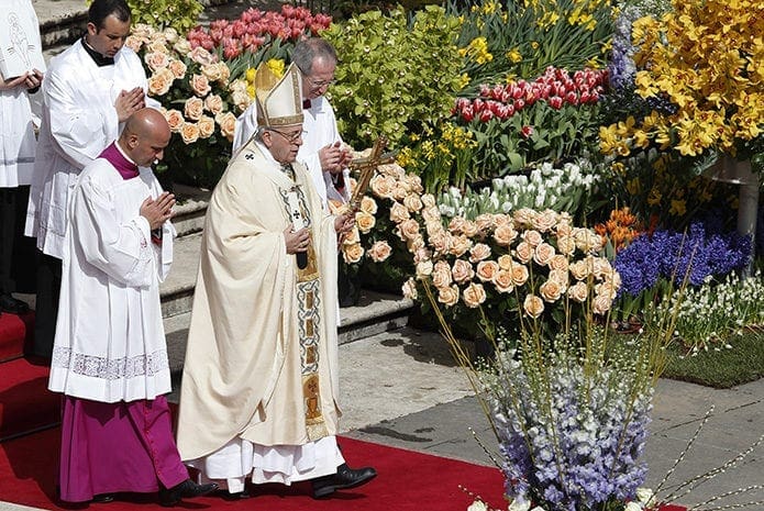 After a stormy Holy Saturday with rain beating down throughout the night, Easter morning dawned bright and sunny at the Vatican, highlighting the thousands of flowers, trees and bushes donated by flower growers in the Netherlands.