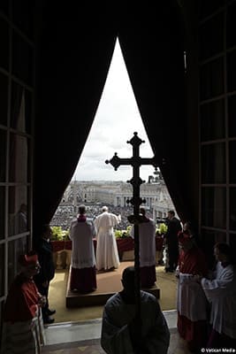 After the Mass and after greeting each of the cardinals and many of the bishops and monsignors present near the altar, Pope Francis climbed into the popemobile for a quick trip around St. Peter’s Square and part of the way down the main boulevard leading to the square. He then went up to the balcony to give his formal Easter blessing.
