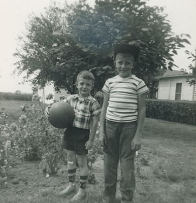 As a kid holding a basketball, Bishop Joel M. Konzen, SM, left, is photographed with his older brother, Raymond, on their grandparents’ farm. He was in the first or second grade at the time of this photograph.