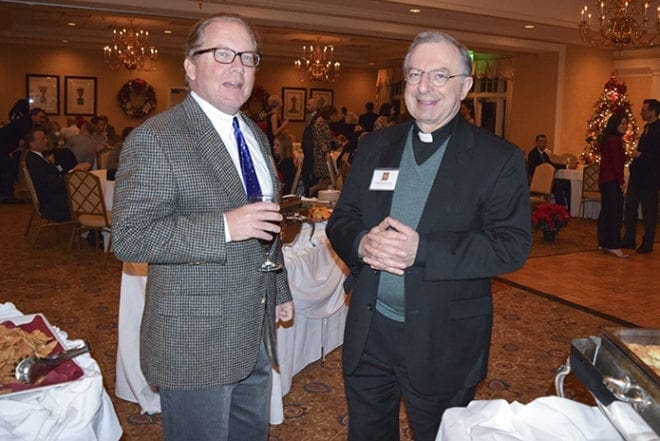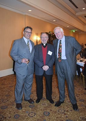 During his previous role as principal of Marist School, Atlanta, and as Father Joel M. Konzen, SM, center, he attends the faculty and staff Christmas party in this December 2015 photo. Standing at his side are science teacher James Naum-Bedigian, left, and theology teacher David Donahue.