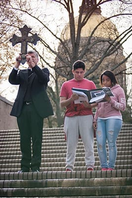 Bishop Bernard E. Shlesinger III holds the cross as students Elder Alcantara, of the Lyke House and GSU, and La’renzia Henderson, Cristo Rey freshman, lead a reflection. Photo By Thomas Spink