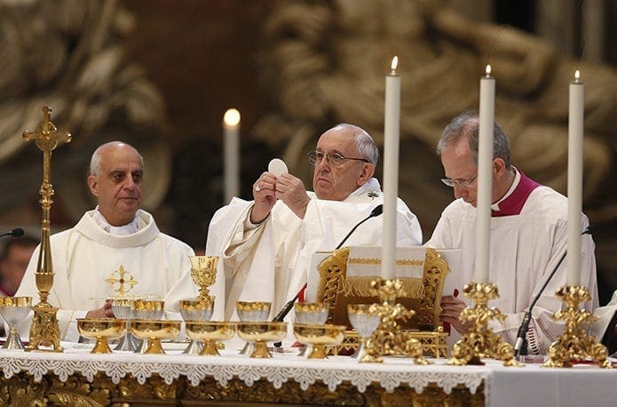 After his speech, Pope Francis celebrated Mass with the missionaries of mercy at the Altar of the Chair in St. Peter’s Basilica.