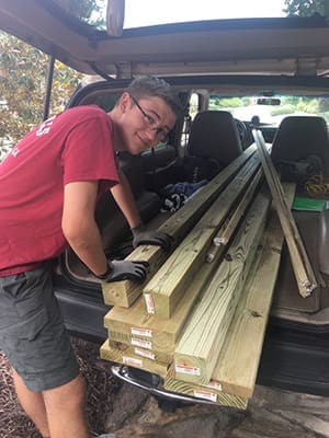 Nate Greve, parishioner of St. Ann Church, Marietta, unloads lumber in preparation for his Eagle Scout project. His project was to construct wheelchair-accessible raised planting beds for the gardening community at Chestnut Ridge Christian Church.