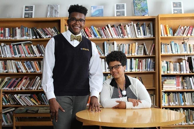 Cristo Rey Atlanta senior Jahari Fraser, standing, is photographed with Lauren Morton, the school’s campus minister since July 2017. Fraser said Morton served as a mentor to him during his final year at the school. Photo By Michael Alexander