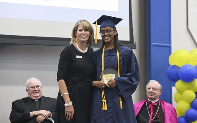 Jada Milligan, right, stands with Camille Naughton, Cristo Rey Atlanta’s vice president of Advancement & Corporate Partnerships, after receiving the St. Ignatius Award. The award recognizes a graduating senior who best demonstrates the qualities and attributes associated with leadership and learning in the Jesuit tradition. Looking on from the background are commencement speaker Jesuit Father John Foley, left, and Bishop Joel M. Konzen, SM, who gave the invocation. Photo By Michael Alexander