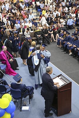 AP science instructor Stanmore Hinds, at the podium, announces the name of each graduate, as Matthew Monroe, center, gives Cristo Rey Atlanta president Bill Garrett a celebratory hug after receiving his diploma. Monroe will be attending Georgia State University, Atlanta. Photo By Michael Alexander