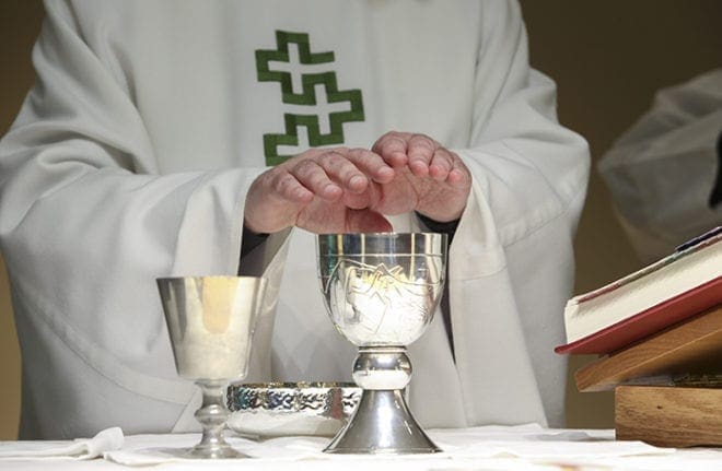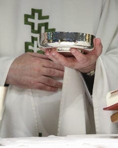 With slight tremors in his right hand due to Parkinson’s disease, Father Paul Burke has made adjustments in way he handles items at the altar. Sometimes he may support the right hand or favor the left hand over the right. Photo By Michael Alexander