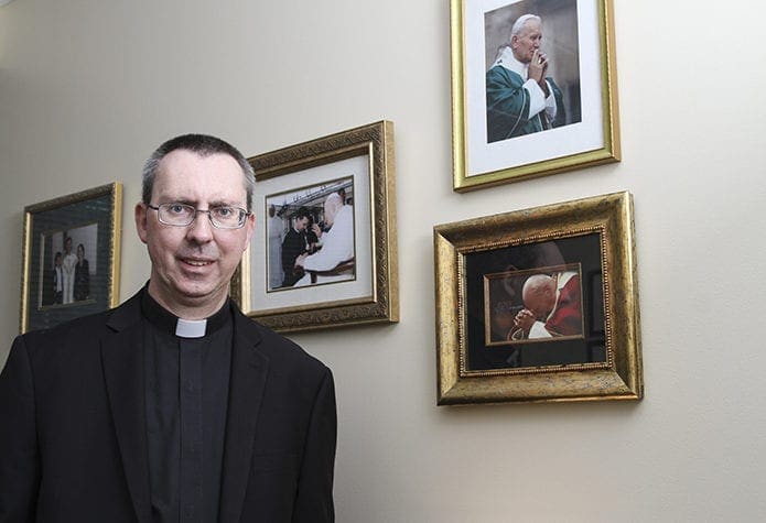 ATLANTA—Photographs of St. John Paul II adorn the walls of Father Paul Burke’s office at the Metropolitan Tribunal. In one picture, a young Father Burke kneels before the Polish pope to receive his blessing.