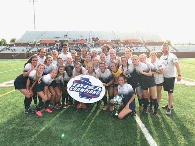 Marist School, Atlanta, captured its first state championship in girls soccer since 2014 with a 2-1 victory over St. Pius X High School, Atlanta. The team is coached by Chandler Yount, standing, first row, far right.