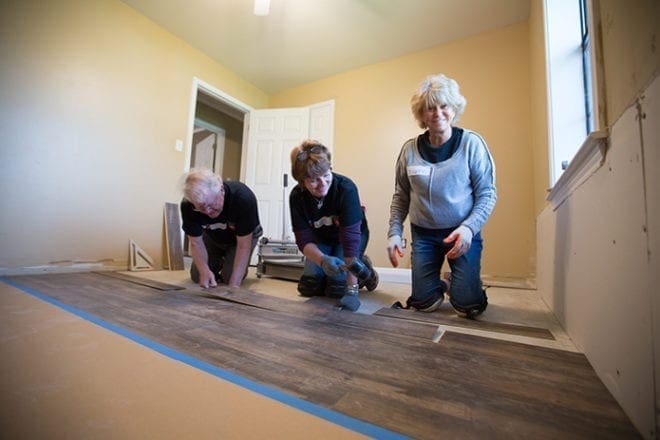 Malteser International Americas, an organization started by the Order of Malta, a Catholic religious lay and chivalrous order established in 1099, serves the Americas with concentrated relief efforts. Tom Wessels, the president of the international group who is also from Atlanta, left, works on laying flooring with other Order of Malta members during a home rehabilitation project following the floods in Lafayette, La. Courtesy of Malteser International Americas