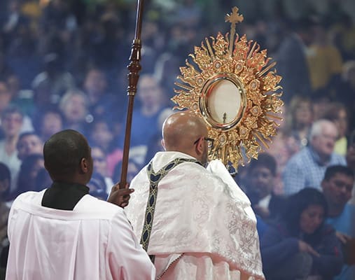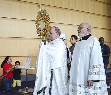 At the conclusion of the June 2 Benediction service, Rev. Mr. Carlos Ortega carries the Blessed Sacrament from the altar in the main hall through the vast assembly of people on the way to the adoration chapel. Photo By Michael Alexander