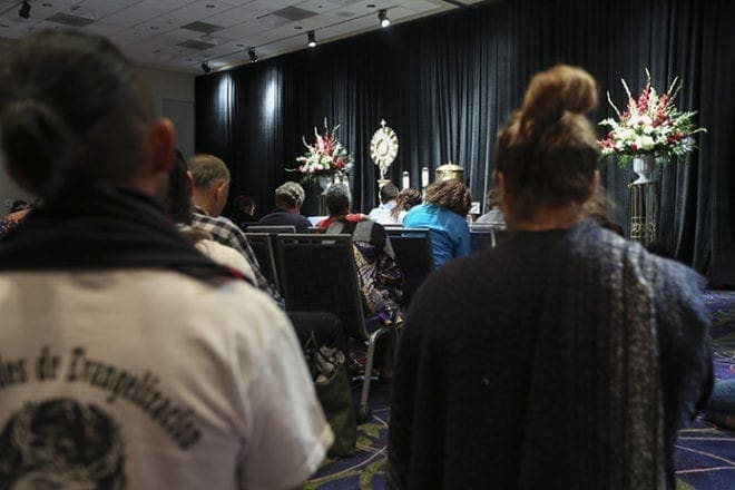 Over the course of the day, people attending the Eucharistic Congress stopped in the adoration chapel, located in the Georgia International Convention Center’s Italian Suite, to pray before the Blessed Sacrament. Photo By Michael Alexander